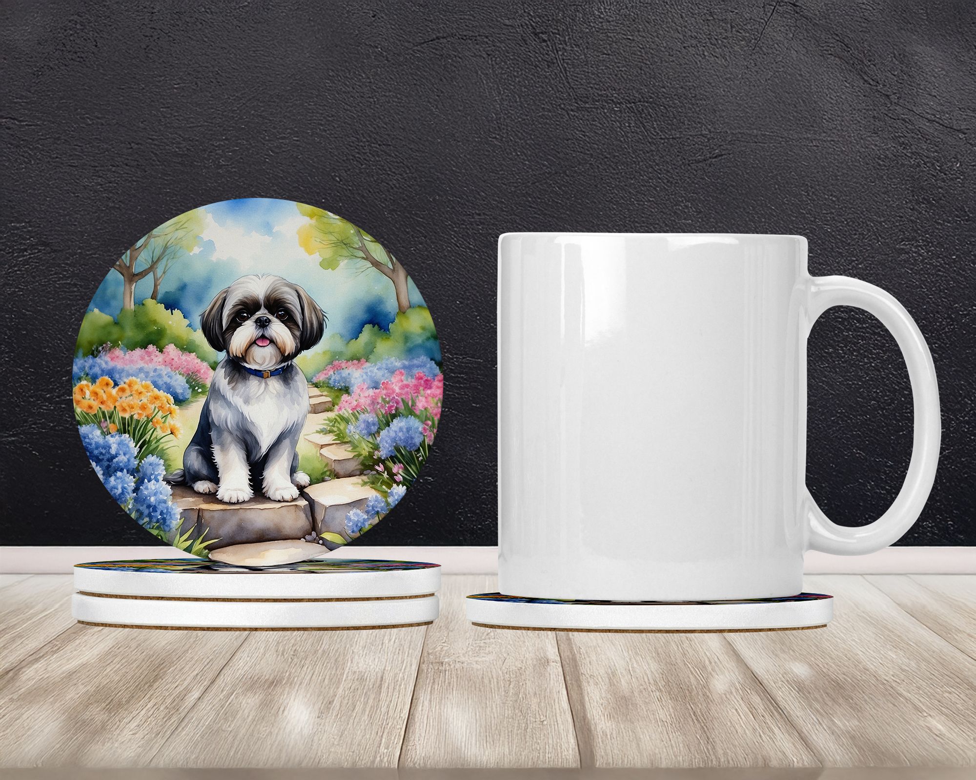 Shih Tzu Spring Path Large Sandstone Coasters Pack of 4 Absorbent Round Coasters Decor Gifts for Men or Women, 4 in, Multicolor