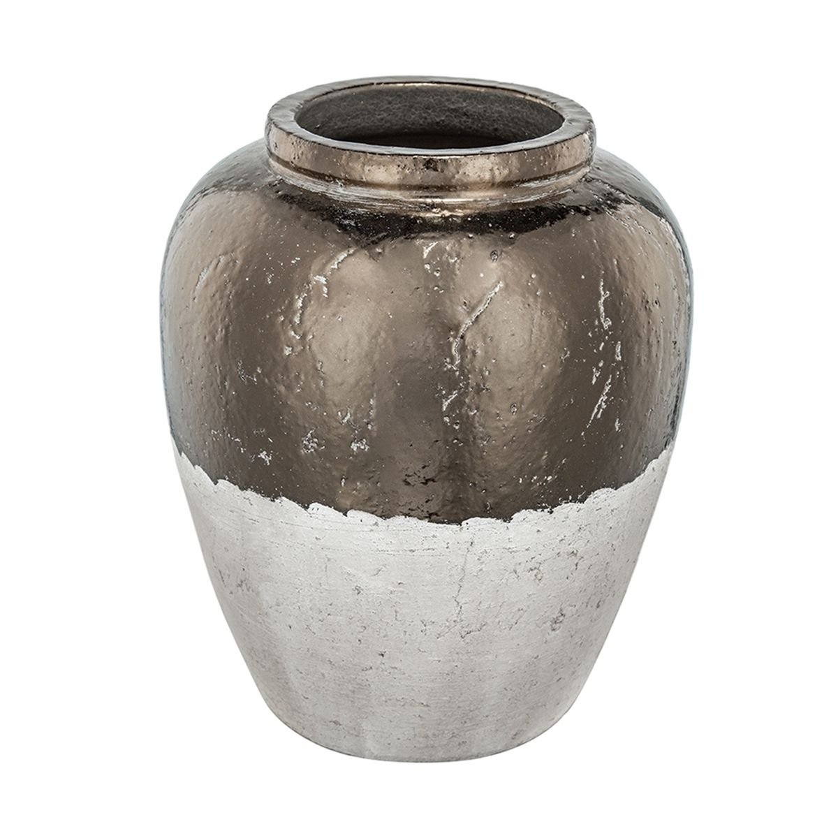 Featuring a round silhouette, a wide opening, and a unique blend of distressed sienna brown tones and a metallic sheen, this decorative vase offers timeless style and function to your home decor.