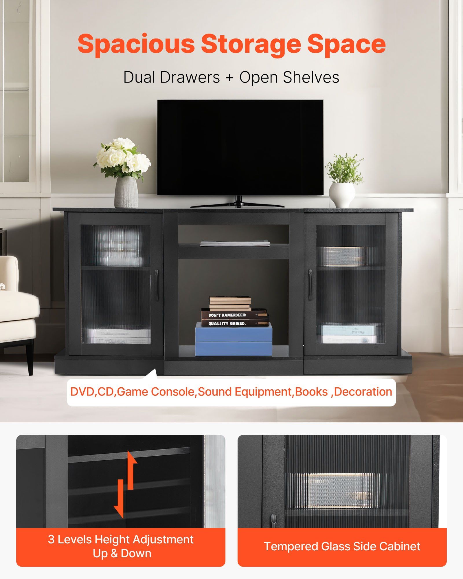 2.Flexible Storage: Featuring adjustable-height shelves, the TV cabinet storage easily accommodates devices of different sizes. Beyond holding a TV, the cabinet and countertop can store decorations, models, books, magazines, DVD/CD collections, gaming devices, and more to adorn your living space