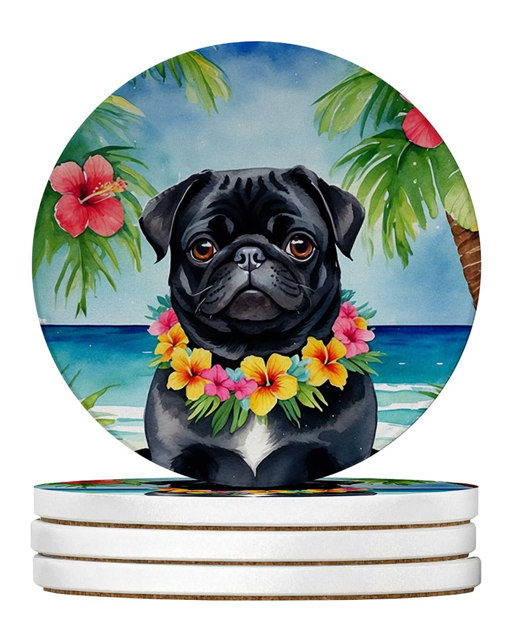 Home > Black Pug Luau Large Sandstone Coasters Pack of 4 Absorbent Round Coasters Decor Gifts for Men or Women, 4 in, Multicolor